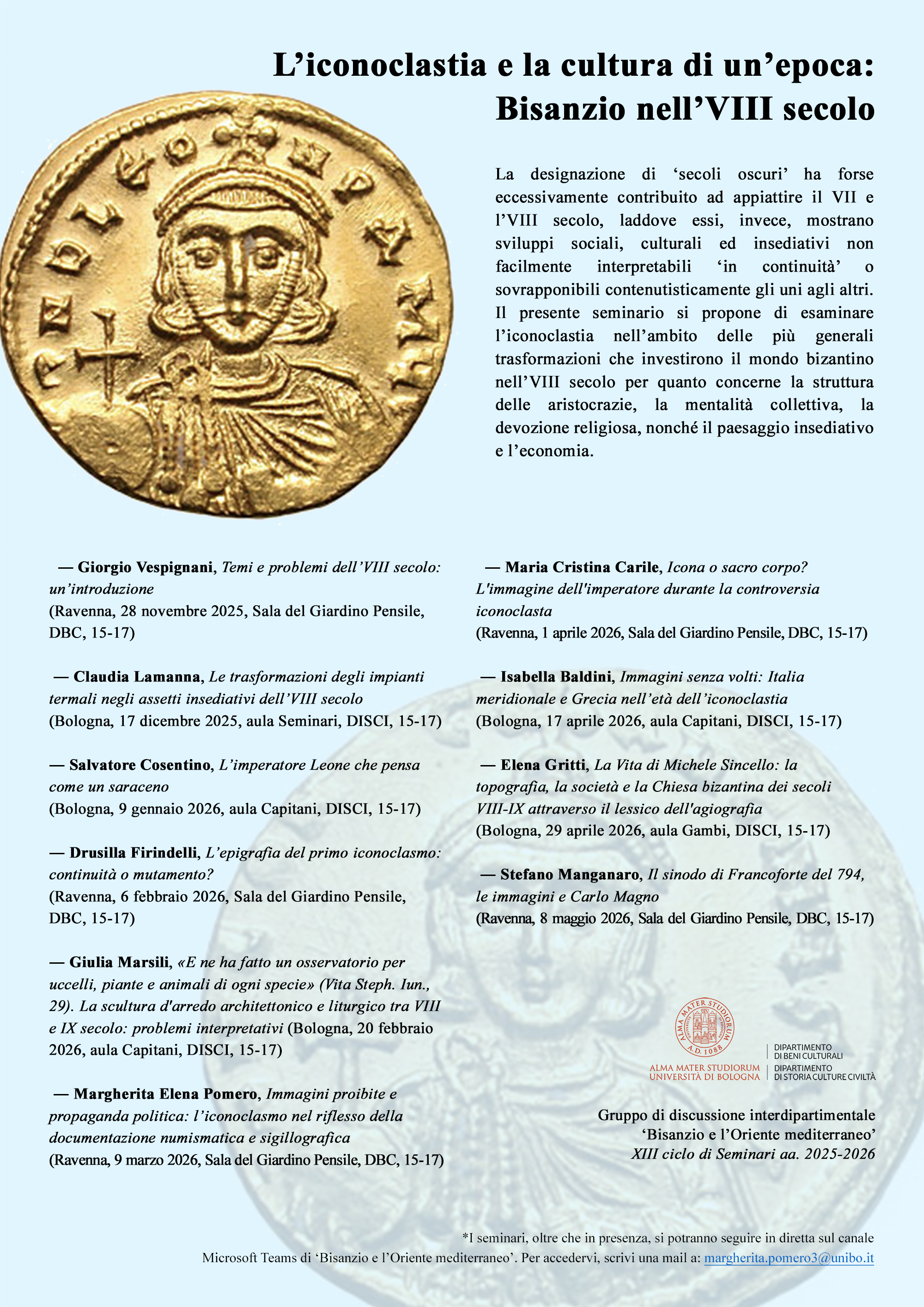 La teologia imperiale relativa al divieto di culto delle immagini sacre, promulgata in due diversi momenti della storia dell’VIII e del IX secolo, sollevò una viva opposizione da parte di settori della società bizantina. Questo tentativo di riforma del cristianesimo ― com’è stato definito ― avveniva sullo sfondo di trasformazioni sociali ed istituzionali nella struttura dell’impero di considerevole portata, soprattutto nei regni di Leone III (717-741) e di Costantino V (741-775). Vi è la tendenza, anche inconsapevole, ad appiattire le dinamiche storiche dell’VIII secolo su questo grande movimento di riforma religiosa, che, con un’ottica a posteriori, mostrò di avere una natura bifronte: da un lato, infatti, la radice della discussione, ovvero la liceità o meno di raffigurare Cristo in forma umana, attingeva ad aspetti del dibattito teologico del V secolo, quando non risaliva ancora più in là, al cristianesimo primitivo; dall’altro, il definitivo consolidarsi dell’icona come tramite di comunicazione con il sacro, sanzionato con la Festa dell’Ortodossia (843), impresse alla storia religiosa del mondo bizantino un tratto che non avrebbe più smarrito nei secoli a venire. Benché tanto specifici aspetti della lotta per le immagini sacre, quanto la contemporanea costituzione di nuovi assetti socio-istituzionali nella società imperiale siano oggi oggetto di dibattito, sembra forse non ancora completamente chiaro nella storiografia il considerevole mutamento che l’VIII secolo determinò rispetto alle dinamiche storiche del secolo precedente. La designazione di ‘Dark Ages’ ha forse eccessivamente contribuito ad appiattire il VII e l’VIII secolo, laddove essi, invece, mostrano sviluppi sociali, culturali ed insediativi non facilmente interpretabili ‘in continuità’ o sovrapponibili contenutisticamente gli uni agli altri. Il presente seminario, pertanto, si propone di esaminare l’iconoclastia nell’ambito delle più generali trasformazioni che informarono il mondo bizantino nell’VIII secolo per quanto attiene alla struttura dei ceti dirigenti, alla mentalità collettiva, alla devozione religiosa, nonché al paesaggio insediativo e all’economia.